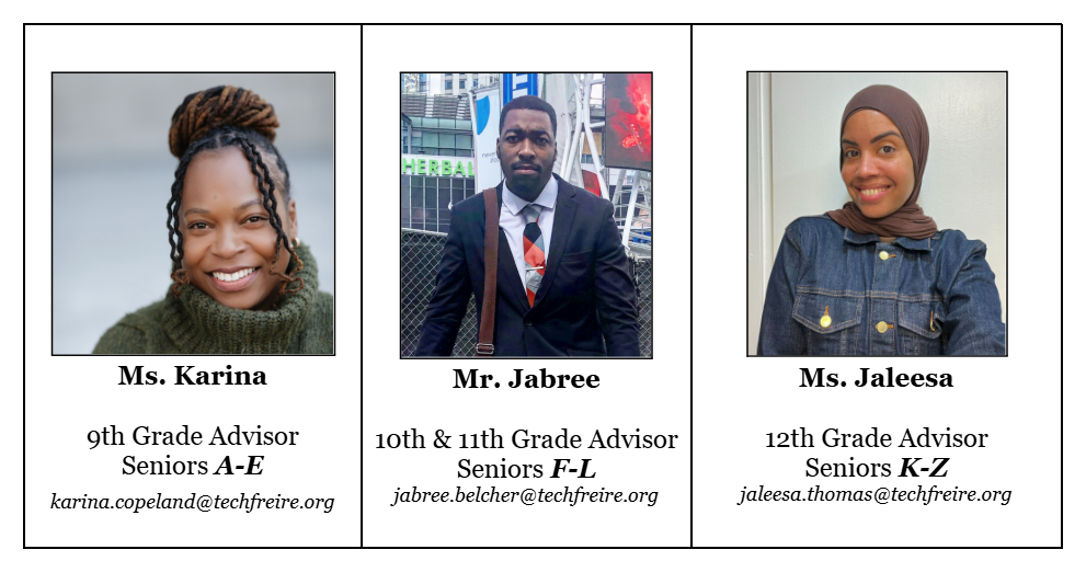 To meet during school hours, email your advisor to set up a meeting. You can also ask your teacher for a pass to come see us for urgent matters — we just ask that teachers reach out to us first to confirm that we are available.